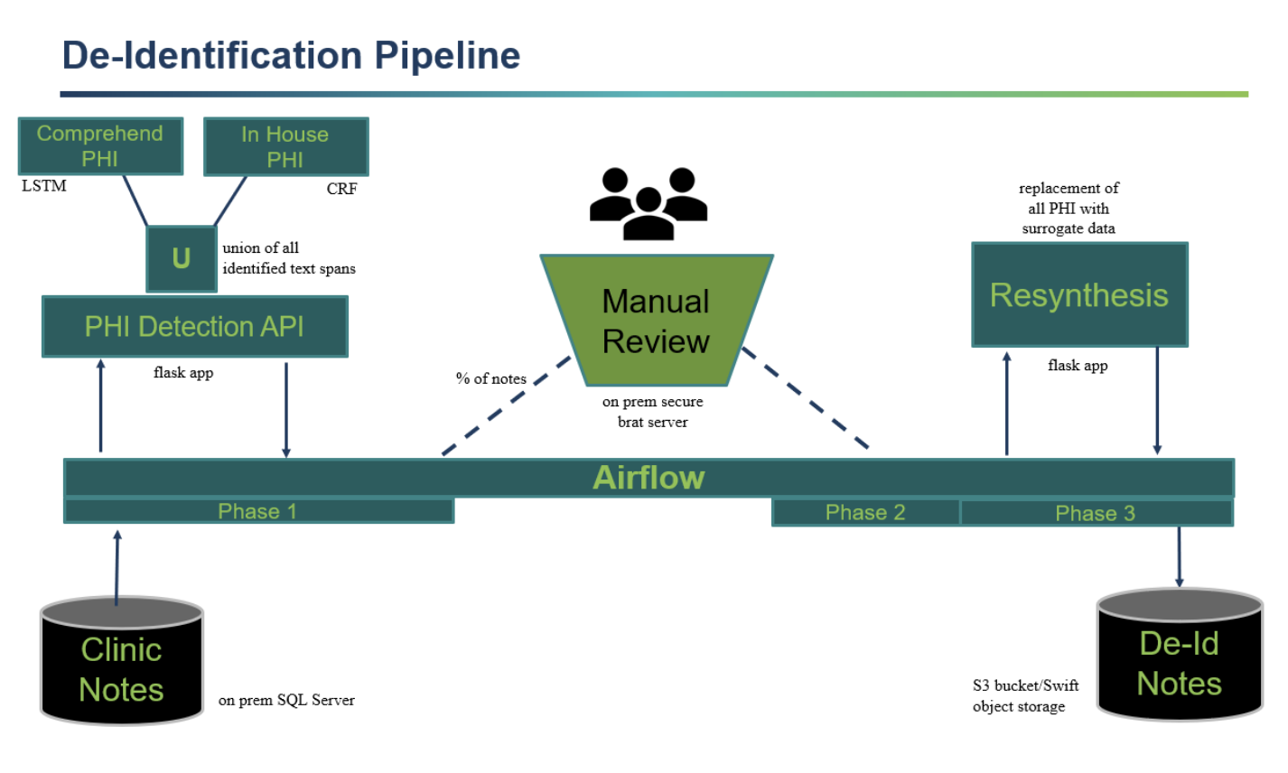- Pull notes from the server and identify personal health information (PHI) using Name Entity Recognition algorithms.